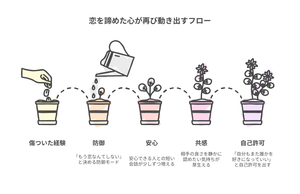 この記事では、「もう恋なんてしない」と思った心が再び動き出すプロセスを追ってきました。